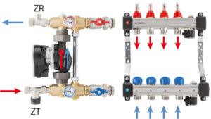 Układ zasilany jest gorącą wodą z instalacji poprzez termostatyczny zawór trójdrogowy, oraz z powrotu wężownic ogrzewania podłogowego (belka powrotna), dzięki czemu następuje mieszanie i obniżenie temperatury wody podawanej na belkę zasilającą rozdzielacza (zasilającą wężownice ogrzewania podłogowego). Obieg wody w instalacji płaszczyznowej wymuszony jest działaniem zabudowanej pompy. Poprzez króciec powrotny woda powraca do instalacji.
