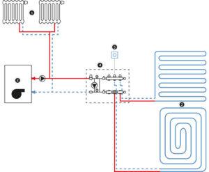 Układ działa na zasadzie zmieszania wody grzewczej pochodzącej ze źródła ciepła z wodą powracającą z wężownic ogrzewania płaszczyznowego.